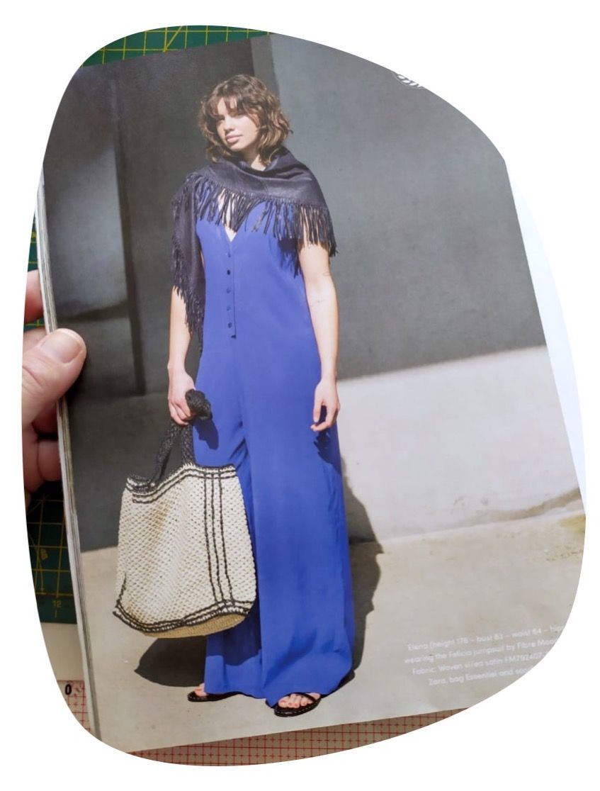D'ailleurs je crois que tous les modèles du magazine me font de l'oeil. Mon modèle est la combi Felicia, prévu plutôt pour un tissu avec une certaine rigidité. Mais moi je voulais du fluide, et les Coupons de St Pierre proposaient en début d'été des coupons de crêpe synthétique à prix très attractif... Comme je savais que je n'aurais pas le courage de faire une toile, j'ai pris peu de risques en taillant dans mon tissu définitif. Pour 40€ les 6 mètres, j'aurais eu peu de regrets si le projet ne m'avait pas plu.