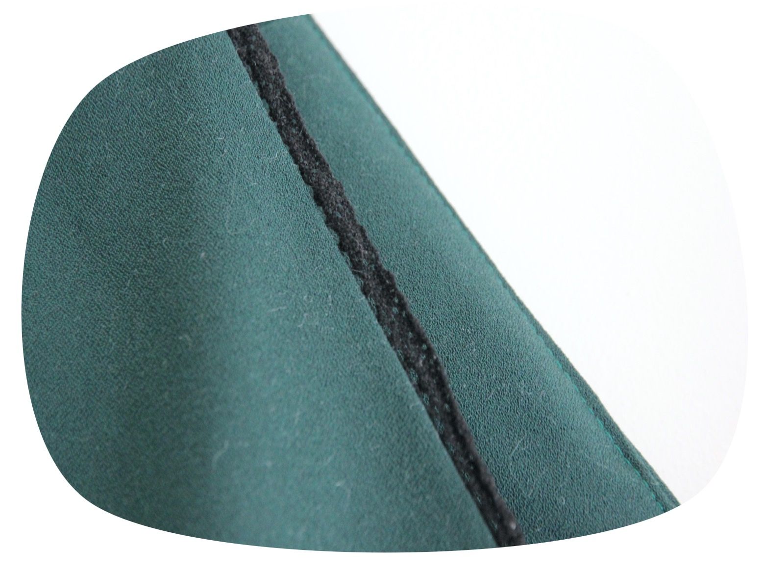 J'ai modifié le dos qui était tout simple, pour créer un V plongeant que j'ai bordé d'un petit galon de dentelle noire (j'ai longtemps cherché un vert qui correspondait, sans succès !). Les petits boutons dorés étaient dans ma vision du projet depuis le départ. Quoi de plus chic que le vert foncé associé au doré ?