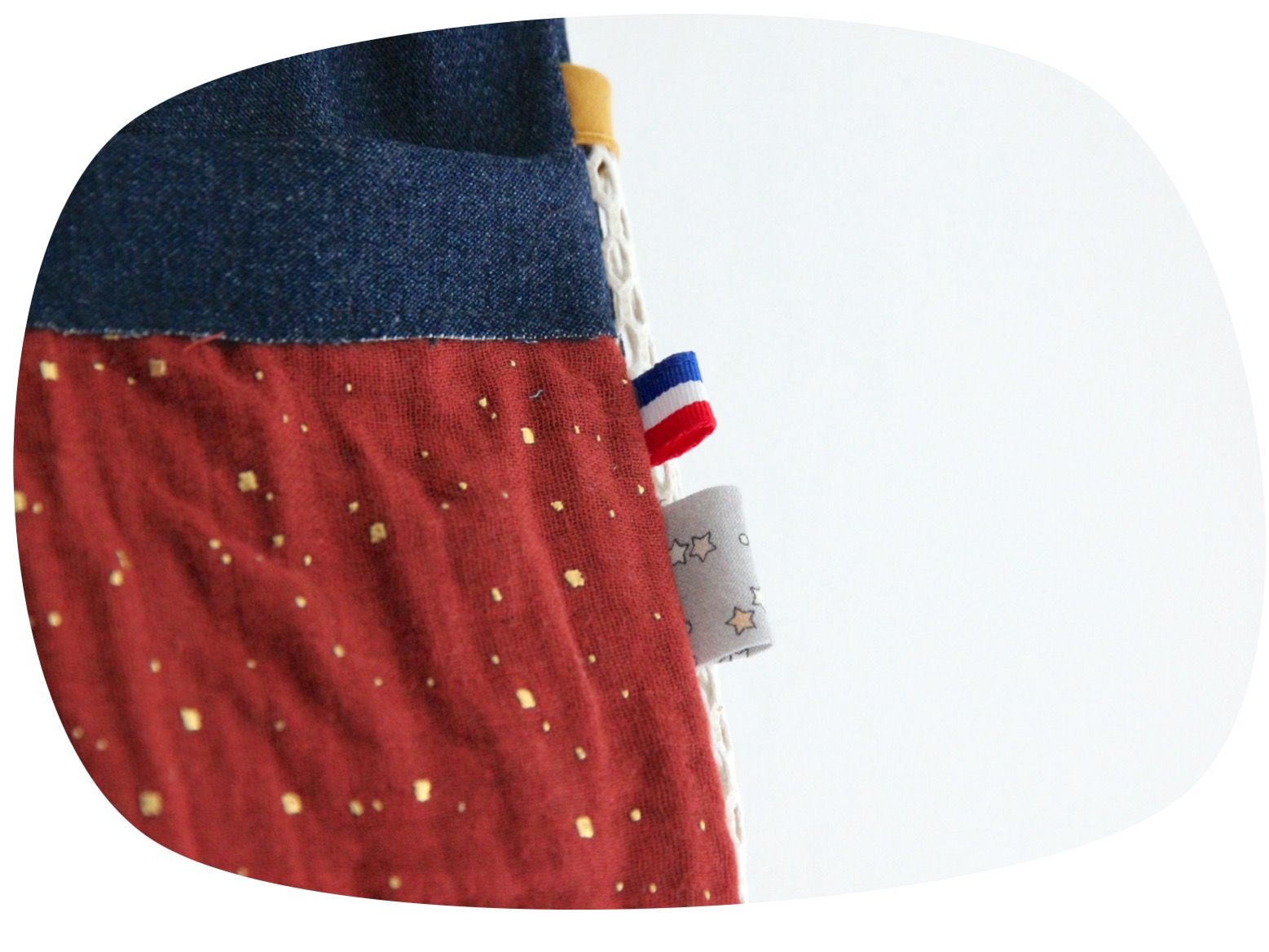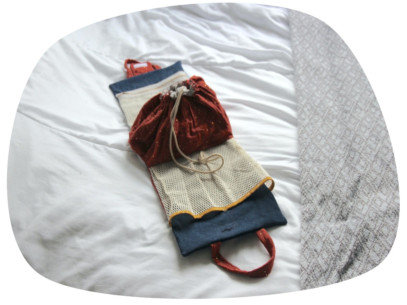 Côté style, c'est une association de denim et de double gaze couleur terracotta, avec du mesh (filet) pour les compartiments intérieurs.
